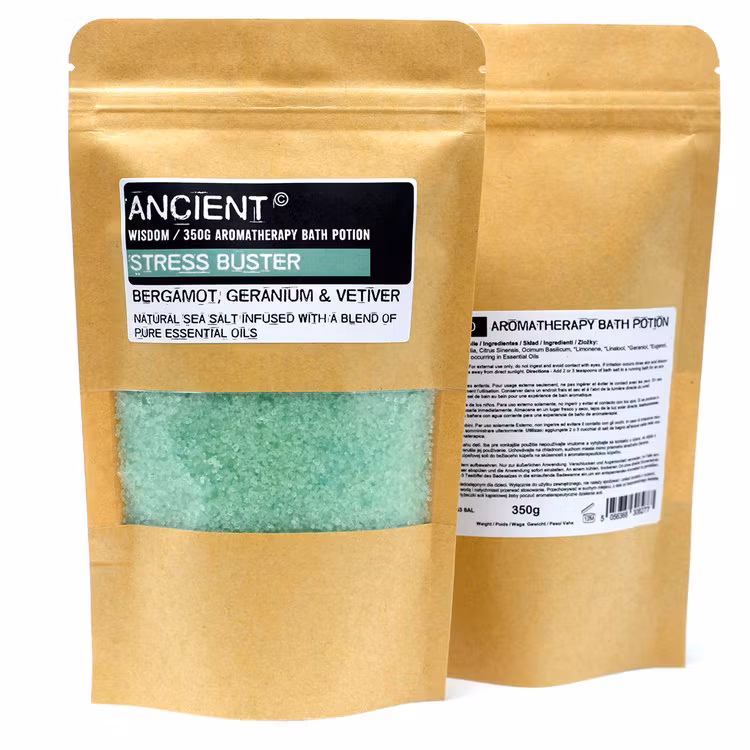Badsaltet är en blandning av havssalt och eteriska oljorna bergamot, geranium och vetiver. Hjälper din kropp att slappna av, rensa ditt sinne och ger ny energi. Tillsätt 2-3 tsk i badvattnet.