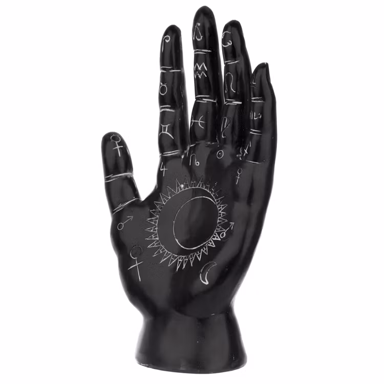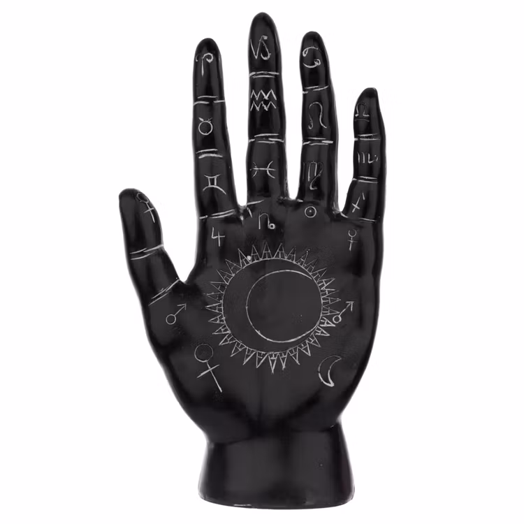Svart och vit Mantrisk Hand Stor. Symbolerna i handen står för stjärntecknen, livet, döden, solen, månen, venus, mars och jupiter.