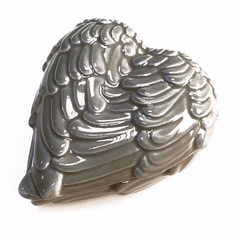 Denna himmelska och exceptionellt detaljerade hjärtformade prydnadsskål är gjord av keramik och har änglavingar som omger hela skålen både på toppen och botten.