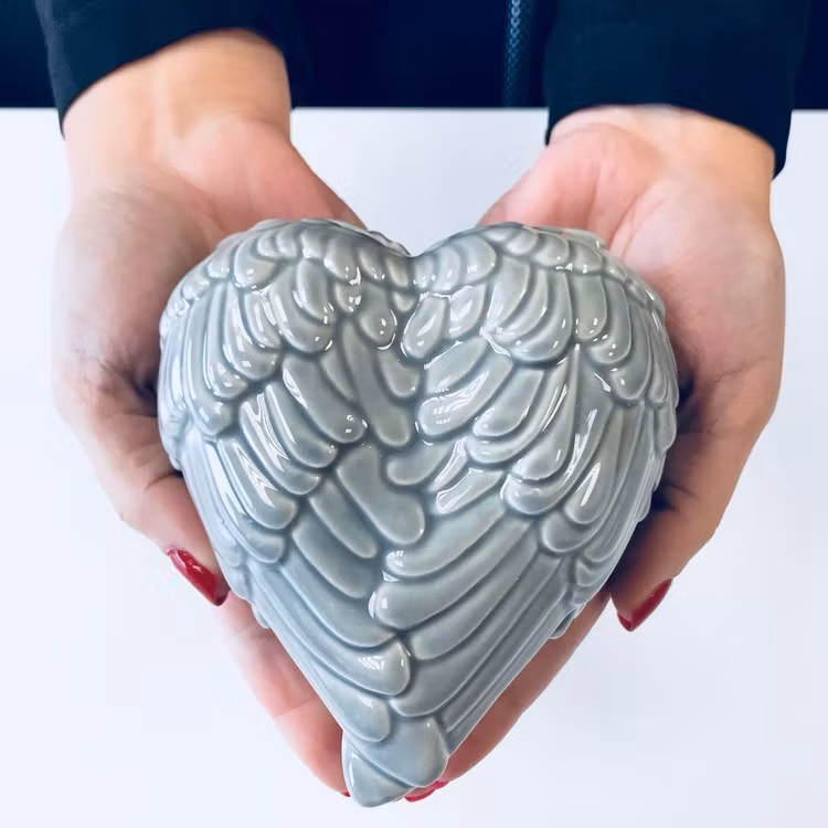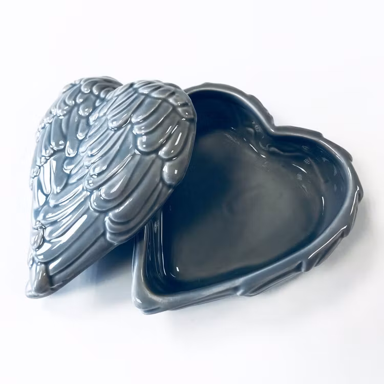 Denna himmelska och exceptionellt detaljerade hjärtformade prydnadsskål är gjord av keramik och har änglavingar som omger hela skålen både på toppen och botten.