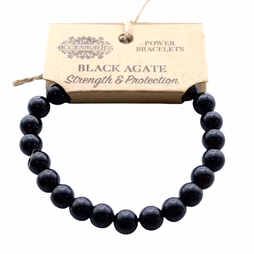 Vackert kraftarmband i stenar av Svart Agat. Ger styrka, skydd, framgång och mod. Skyddar mot stress och mardrömmar. Resårarmband.